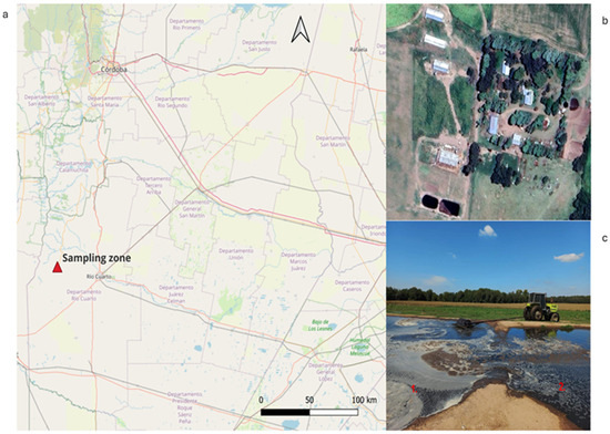 Sampling was carried out on a farm in the south of the province of Córdoba, Argentina (33°02′49.4″ S, 64°48′24.0″ W). There, wastewater generated by the cleaning of farrowing pens is discharged once a week into an aeration lagoon, where it is treated mechanically. More precisely, machinery in the lagoon stirs the water and supplies it with oxygen to promote the biological degradation of organic matter by aerobic microorganisms. Then, solids are removed by sedimentation, and the wastewater proceeds to a second, stabilization-only lagoon, in which it undergoes additional decantation/sedimentation for 7 to 10 days. Having thus only received primary treatment (i.e., basic treatment to remove solid particles), the wastewater is finally released into the field to irrigate crops. The samples for our study were collected about 30 to 50 cm below the surface in the second lagoon, on day 10, just before the water was released into the field, so that it would be as stabilized as possible. Figure 1 shows the location of the rural establishment where sampling took place and both lagoons.