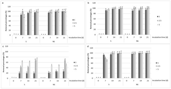 Figure 2 shows the removal percentages registered in sterile and natural wastewater inoculated with the different fungal pellets. In samples inoculated with RCA2 (Figure 2a), rising herbicide concentrations were associated with increasing removal percentages for the duration of the incubation. By day 7, removal was over 80% under all the conditions assayed. In natural and sterile wastewater supplemented with 2.5 and 5 mmol L−1 of 2,4-D, removal was 100 and 99% after 14 and 21 days of incubation (p < 0.001). Natural wastewater containing 1 mmol L−1 of the herbicide also exhibited complete removal after 21 days.