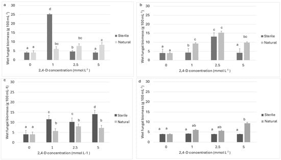 Wet fungal biomass in sterile and natural rural wastewater at 25 °C, supplemented with different 2,4-D concentrations (1, 2.5, and 5 mmol L−1) and inoculated with (a) A. oryzae RCA2; (b) A. oryzae RCA4; (c) A. oryzae RCA5; and (d) A. oryzae RCA10. Measurements were made at the end of the removal assay (42 days). Mean values are based on triplicate data. a–d: Means in a row with a letter in common are not significantly different according to the LSD test (p < 0.01).