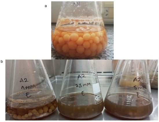 (a) Fungal pellets of A. oryzae RCA4 formed after 5 days of incubation in synthetic wastewater. These pellets were directly inoculated into natural and sterile wastewater for the 2,4-D removal assay. (b) A. oryzae RCA4 fungal pellets after 42 days of incubation in the removal assay.