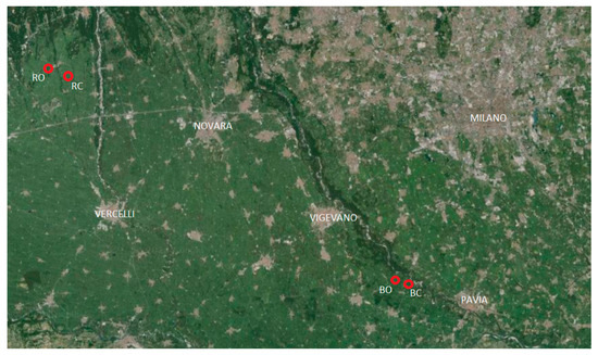 Our research focuses on the North Italian rice cultivation district, where 4 different farms under two different production models were monitored during the 2022 cropping season. Target farms were chosen for being located in two of the most important rice-producing provinces in northern Italy, Pavia and Vercelli, and for their production model, organic or conventional. Pavia and Vercelli provinces account for 35.6% of the total area and 30.1% of national production and 32.1% of the total area and 36.9% of national production, respectively [40]. Two farms are in Bereguardo rural area (PV), and two are in Rovasenda rural area (VC) (Figure 1). Located in the plains of Lombardy and Piedmont, respectively, these regions lay in a Cfa climate zone according to the Köppen classification, characterized by hot, humid summers and mild, wet winters. Bereguardo receives a mean (2021–2024) annual rainfall of 631.1 mm (450 mm in 2022, data from ARPA Lombardy), with an average yearly (2021–2024) temperature of around 13.7 °C (14.4 °C in 2022, data from ARPA Lombardy). Rovasenda, on the other hand, has a mean annual (2021–2024) rainfall of 1143 mm (576 mm in 2022, ARPA Piedmont), with an average annual (2022–2024) temperature of 13.5 °C (14.1 °C in 2022, ARPA Piedmont). These favorable climatic and hydrological conditions, coupled with rich alluvial soil composition, provide optimal conditions for rice cultivation, which has been supported over time by the development of advanced irrigation systems, including traditional water management techniques refined over centuries.