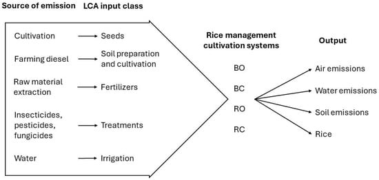 The Life Cycle Assessment (LCA) methodology was used to estimate the environmental impacts of 4 rice management scenarios (BO, BC, RO, RC). ISO 14040/44 standards (ISO, 2021) and the Product Category Rule guideline “ARABLE AND VEGETABLE CROPS” developed by International EPD System were used as references [45].