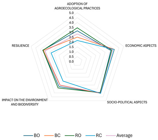 Concerning the sociopolitical aspects, RC ranks highest (4.07) due to strong labor contracts, training participation in agroecology circuits, and the use of culturally significant rice varieties. However, its engagement in social cooperation networks is limited. BC (4.05) also scores well due to respect for labor conditions but shows low involvement in enhancing local markets or traditions. BO (3.99) and RO (3.97) foster stronger community and cultural networks. RO, in particular, emphasizes ancient rice varieties and biodiversity and actively cooperates with local networks. Nonetheless, the intense workload in RO, due to fully autonomous operations, negatively affects the quality of life of workers. BO implements participatory work management but relies externally for machinery-intensive phases like harvesting.