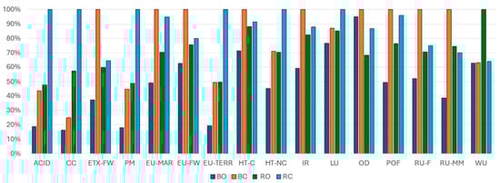 The results demonstrate that the scenarios exhibit diverse environmental performance across all impact categories. Upon examination of the raw data from the comparison, an analysis of the average impact percentages in all categories indicates that RC has the highest average impact (88%), followed by BC (80%), RO (70%), and, finally, BO (48%). This indicates that, in general, the RC scenario has the highest environmental impact.