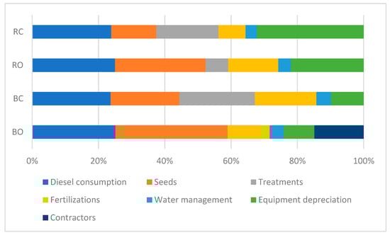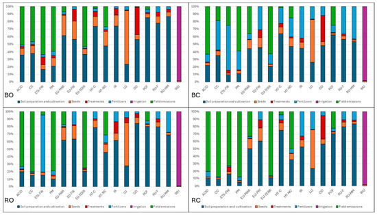 Figure 5 focuses on the gravity analysis within different scenarios. The analysis shows that soil preparation and cultivation activities represent the largest contributions of environmental impact (BO 49%, BC 37%, RO 46%, and RC 40%). The second and third largest contributors vary depending on the scenario being considered. In the BO, RO, and RC scenarios, field emissions have an average between impact categories of 20–33% and represent the second contributor. Conversely, in the BC scenario, the second contribution comes from the fertilizer production of 24%.