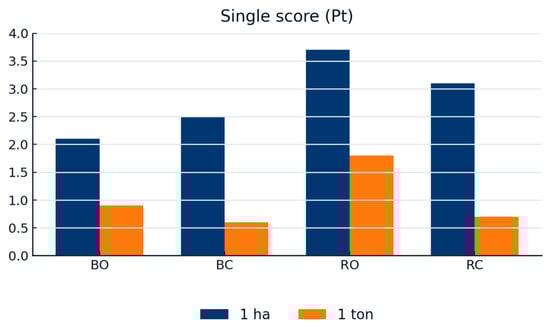 However, when examining the individual scenarios and specific impact categories, the BO scenario exhibits lower impacts than the others in the majority of impact categories (15 out of 16), with the exception of OD, where the best performance is represented by the scenario RO. A comparison of the four scenarios reveals an increasing trend between the organic and conventional scenarios in all impact categories. In at least one of the conventional scenarios (BC and RC), the impact levels are higher than in the organic scenario (BO and RO), apart from the WU impact category, where the water management for RO is almost 40% more than the conventional.