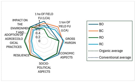 Finally, concerning the resilience of the farming activity, BO and RO show the highest resilience scores (3.74 and 3.72). BO strengthens its resilience via cover cropping, seed recycling, mechanical weed control, and diversified products. RO shows high climate resilience through its green mulch system and reduced input dependency, although resilience is slightly limited by the fragility of rice varieties and lack of water reserves. BC (3.67) benefits from infrastructure and consistent yields, though high input dependency compromises ecological resilience. RC, scoring 2.83, exhibits severe weaknesses. Despite high mechanization, its conventional monoculture model, chemical reliance, and rigid market demands (focused on white rice) reduce farm autonomy and expose it to climate and market stresses.