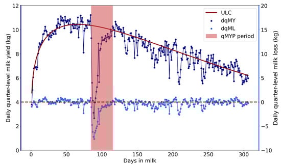 Altered milk yield dynamics caused by CM often appear as perturbations in the lactation curve [13]. To detect quarter-level milk yield perturbations (qMYPs), the unperturbed lactation curve (ULC) of each quarter for each lactation was estimated using the iterative Wood model with variable thresholds [13,30]. The ULC of each quarter lactation was subtracted from the daily quarter-level milk yield (dqMY) to obtain the daily quarter-level milk loss (dqML) series (Figure 1). Milk loss is negative when the dqMY is lower than the ULC, resulting in a negative dqML value. In our study, a qMYP was defined as a period of at least 3 successive days of negative dqML for which dqMY dropped at least once below 90% of the expected yield (e.g., ULC). A qMYP was considered recovered if the dqML returned to a positive value. Additionally, a qMYP was attributed to a CM case when the period of the qMYP included the CM detection day or began within one week after the detection day.