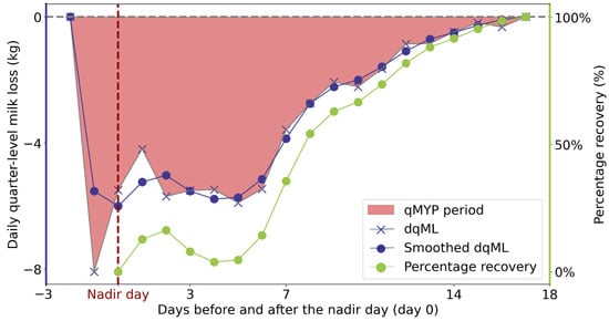 To define the percentage recovery, the qMYP was divided into a “developing phase” and a “recovery phase”. To this end, we smoothed the dqML series of each qMYP using a third-order Savitzky–Golay polynomial smoother with a window size of 5 days. The maximum milk loss (MML) was identified as the minimum of the smoothed dqML associated with the qMYP. The “developing phase” and the “recovery phase” of the qMYP are, respectively, the periods before and after the day of MML (i.e., the nadir day). The percentage recovery was defined as 1 − for each day during the recovery phase. The term , which is the proportion of milk loss in comparison to MML, represents the percentage of milk yield that cows would still need to recover to reach the expected level of milk production when no perturbation was present [13,36]. An example of a qMYP and its associated percentage recovery is shown in Figure 2.