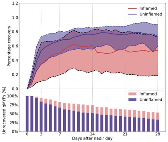 The percentage recovery was calculated separately for inflamed and uninflamed quarters over the four weeks following the nadir day. To focus on the active recovery phase, qMYPs were excluded once recovery was achieved; therefore, fewer qMYPs are included in the later periods over the course of four weeks. Overall, the median percentage recovery in the inflamed quarters was lower than in the uninflamed quarters, as shown in Figure 3. The inflamed quarter recovered approximately 30% from MML by day 3, 50% by day 7, and 60% by day 14, with a slight decline in the following weeks. In contrast, the uninflamed quarters recovered around 60% by day 3, 70% by day 7, and 80% by day 14, maintaining a similar recovery level thereafter.