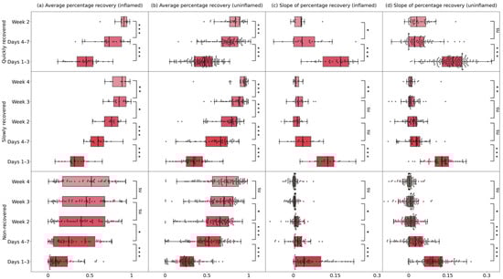 Boxplots of (a,b) average percentage recovery (APR) and (c,d) the slope of percentage recovery (SPR) in inflamed and uninflamed quarters within different groups. Groups were separated by the recovery length of quarter-level milk yield perturbation (qMYP): quickly recovered (qMYPs recovered within 2 weeks), slowly recovered (qMYPs recovered in week 3–4), and non-recovered (qMYPs recovered > 4 weeks or not recovery). The markers above each box represent the results of comparing APR and SPR between adjacent time intervals using the Mann–Whitney test. “*”, ”**”, and “***” indicate significant differences, with p < 0.05, p < 0.01, and p < 0.001, respectively, between these groups, while “ns” indicates no significant difference.