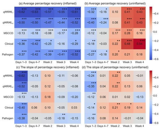 Figure 5 presents the Spearman correlation coefficients between qMRML, MSCCD, clinical severity, causative pathogens, and APR as well as SPR across different time intervals. Most of the correlations are statistically significant (p < 0.05), indicating meaningful associations between these factors and recovery levels. As shown in Figure 5, qMRML, MSCCD, clinical severity, and causative pathogens are negatively correlated with APR in inflamed quarters, indicating that greater milk loss, higher SCC, more severe clinical signs, and the presence of major pathogens are associated with poorer recovery. Similarly, these variables show negative correlations with SPR during the first three days in inflamed quarters. In uninflamed quarters, these variables show negative correlations with APR during the first week, indicating poorer early recovery, but shift to positive correlations in the following weeks, suggesting improved recovery over time. For SPR, negative correlations were observed during the first three days, but positive associations were observed in certain time periods thereafter.