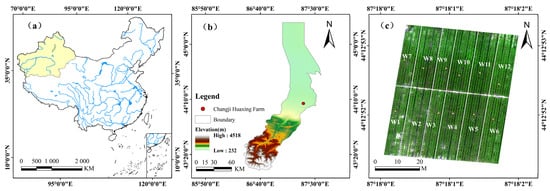 Overview map of the study area. (a) Location map of the study area; (b) elevation map of the Changji Huaxing Farm experimental area; (c) UAV image of the experimental plots.Note: The delineated boundaries represent the extent of the research region and do not necessarily reflect internationally recognized borders.