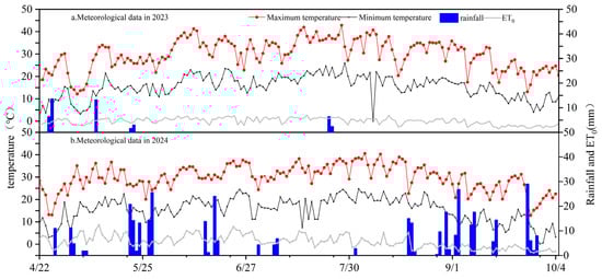 Meteorological data during the cotton growing season in 2023 (a) and 2024 (b).