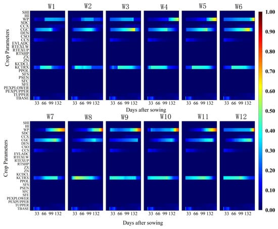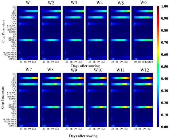 Temporal variation of the total-order sensitivity index (TOSI) of aboveground biomass (AGB) for different crop parameters under 12 irrigation treatments (W1–W12) throughout the growing season. The x-axis represents days after sowing (DAS), the y-axis lists the crop parameters considered in the sensitivity analysis, and the color scale indicates the magnitude of the TOSI (0–1), where higher values denote a greater overall contribution of the parameter to the model output, including both its individual effect and interactions with other parameters.
