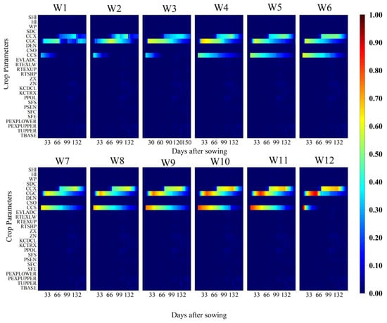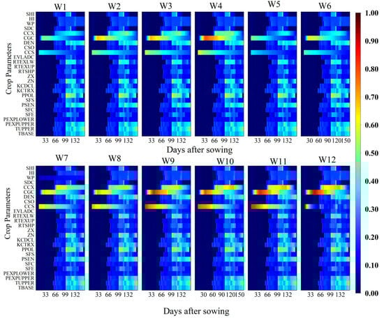 Temporal variation of the first-order sensitivity index (FOSI) of canopy cover (CC) for different crop parameters under 12 irrigation treatments (W1–W12) throughout the growing season. The x-axis represents days after sowing (DAS), the y-axis lists the crop parameters considered in the sensitivity analysis, and the color scale indicates the magnitude of the FOSI (0–1), where higher values denote a greater influence of the parameter on the simulated CC.