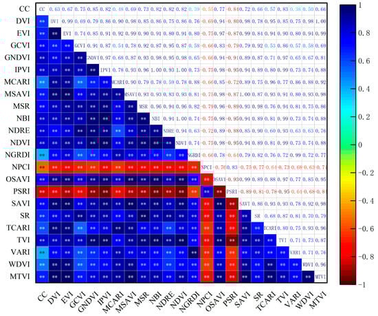 Correlation analysis between vegetation indices and canopy cover (CC).Note: ** indicates significance at the p ≤ 0.01 level. The same notation applies hereinafter.