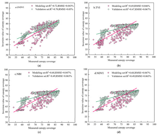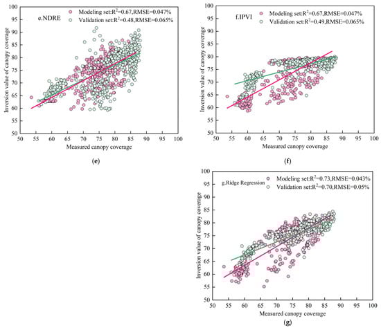 Relationship between remotely sensed and measured canopy cover (CC). Note: (a–g) represent the CC inversions modeled by GNDVI, TVI, NBI, NDVI, NDRE, IPVI, and ridge regression, respectively.