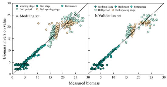 The results show that the models constructed for the budding and flowering stages achieved the highest accuracy, suggesting that the VI-based inversion performs better during periods of rapid canopy expansion and biomass accumulation. The model for the boll-setting stage also exhibited good fitting accuracy, although with slightly higher RMSE, which may be attributed to increased structural complexity of the canopy and greater spectral interference during boll development. In contrast, the models for the seedling and boll-opening stages showed relatively lower accuracy, indicating that VIs are less sensitive to biomass variation during the early and late growth periods.