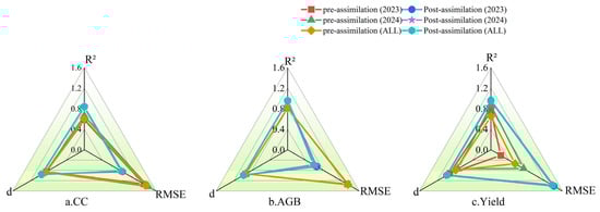 Existing research on assimilating remote sensing data with crop models mainly focuses on satellite or hyperspectral remote sensing. Studies demonstrate that integrating remote sensing data significantly enhances crop yield simulation accuracy [,,]. For instance, Francesco Novelli et al. [] assimilated satellite-derived leaf area index (LAI) into the Environmental Policy Integrated Climate model (EPIC) model, considerably reducing discrepancies between observed and simulated LAI, thereby significantly improving crop yield estimations. Similarly, Junyi Liu et al. [] combined the WOrld FOod STudies model (WOFOST) crop growth model with Sentinel-2 satellite data, enhancing model adaptability to specific parameters and spatiotemporal representativeness of LAI observations, thus effectively estimating maize hybrid yield. Sellaperumal Pazhanivelan et al. [] calibrated the Decision Support System for Agrotechnology Transfer (DSSAT) model using remote sensing data, enhancing the model’s capability to capture physiological responses of rice and consequently improving regional rice yield simulation accuracy.