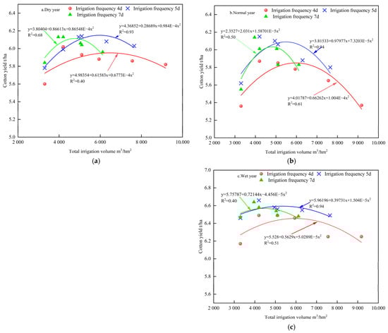 The experiment employed subsurface drip irrigation with cotton variety Zhongmian 113, planted using a “one-film-three-tubes-six-rows” mechanically harvested cotton planting pattern, featuring row spacing of 66 + 10 cm and plant spacing of 8.5 cm. Drip irrigation tapes were placed at the center of the narrow rows, with emitter flow rates of 2.6 L·h−1 and emitter spacing of 25 cm. Irrigation water was sourced from a channel system, with precise irrigation volumes controlled via water meters. To align the experimental conditions with standard production practices, no special soil amendments or fertilization treatments were applied before sowing, and fertilization protocols followed the local standardized cultivation guidelines. Cotton was sown on 23 April 2023 and 28 April 2024 and harvested on 5 October 2023 and 30 September 2024. Experimental data collection periods were from 8 June to 5 October 2023 and from 8 June to 30 September 2024. The experimental design included various combinations of irrigation cycles and frequencies, with specific treatments and plot layouts detailed in Table 1. Each treatment was conducted with three replicates, and the plots were arranged in a randomized complete block design to minimize the effects of spatial heterogeneity.