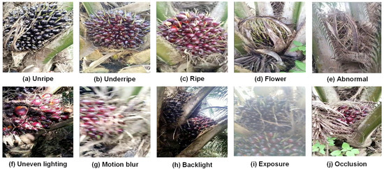 The dataset is sourced from the Science Data Bank [31]. The researchers collected samples from palm trees located in an oil palm plantation in Kalimantan Province, Indonesia [32]. It is constructed through video recordings captured at 30 frames per second across the plantation. These videos are acquired at a resolution of 320 × 640 pixels, and their image size is between 50k and 100k, with individual frames subsequently extracted and professionally annotated using the Computer Vision Annotation Tool (v2.4.8.). The dataset categorizes palm fruit images into five distinct stages: flowering stage, early fruiting stage, transitional fruiting stage, mature and harvest-ready fruit, and abnormal specimens exhibiting characteristic features indicative of potential disease or irregularities. Representative images of each class are illustrated in the upper part of Figure 1: (a) anripe, (b) underripe, (c) ripe, (d) flower, (e) abnormal. Videos are recorded by circumnavigating each tree at different heights during distinct times to capture palm fruit images from multiple viewing angles. As illustrated in the lower part of Figure 1, the collected images exhibit real-world complexities arising from (f) uneven lighting, (g) motion blur, (h) backlight, (i) exposure, and (j) occlusion. The dataset of palm fruit ripeness contains 12,560 photos. The study divided the dataset in a 7:2:1 ratio, yielding 8792 images for the training set, 2512 for the validation set, and 1256 for the test set.