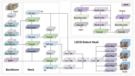 YOLOv8, launched by Ultralytics, attains superior mean average precision across multiple object identification benchmarks due to an enhanced backbone network design, a more refined feature pyramid network, and an optimized training method. It achieves an optimal equilibrium of speed, accuracy, and user-friendliness, rendering it an appropriate fundamental network for the identification of palm fruit ripeness. However, YOLOv8 still has a relatively large model size and computational complexity, and there is still room for improvement in its adaptability to resource-constrained environments. This study mainly enhances the overall performance and recognition robustness of the original YOLOv8 for palm fruit ripeness assessment by integrating StarNet into the YOLOv8 network. The architectural modifications comprise four key elements: (1) initial integration of the LSCD detection head; (2) substitution of the original backbone network with StarNet for reduced computational demands; (3) replacement of default C2F modules with C2F-Star blocks; and (4) utilization of DIoU rather than CIoU as the bounding box regression loss function to enhance localization accuracy. This integrated approach simultaneously addresses model efficiency and recognition performance. The improved network structure is shown in Figure 2.