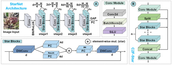 Building upon prior research, Ma et al. [33] introduced StarNet, which demonstrates impressive computational efficiency and low latency through its compact architecture under constrained resource budgets. The core StarNet operation maps inputs into a high-dimensional, non-linear feature space without requiring network expansion, thereby significantly enhancing the model’s feature representation capacity. Part A of Figure 3 illustrates the network structure of StarNet. For object detection networks such as YOLO, this mechanism proves particularly effective in capturing subtle structural variations within images. Within single-layer neural networks, the star operation achieves feature fusion through element-wise multiplication of linearly transformed features, formulated as