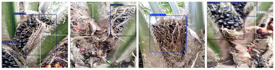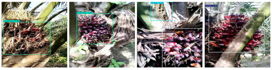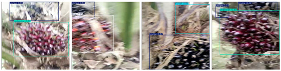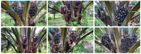 The dataset employed in this study primarily consists of proximity shots captured at very close range to palm fruits. While effective for detailed ripeness assessment, exclusive reliance on such near-field imagery imposes operational inefficiencies for large-scale ripeness screening. To further validate the generalizability of our proposed model, we conducted additional testing using newly captured palm fruit images acquired from operationally efficient vantage points. We utilized mobile phones to walk around palm trees in the PT. PALMINA UTAMA palm plantation in Kalimantan, Indonesia, to capture images of palm fruits on location, employing the ripeness identification model developed in this paper to analyze the acquired images. We employed regular smartphones instead of professional equipment for filming. Any smartphone possessing basic photographic functionalities is appropriate for use. As shown in Figure 4, our ripeness recognition model effectively identifies the ripeness of palm fruit under optimal operational conditions. The size of the palm fruit ranges from one-fifth to one-third of the image height. The scaling in Figure 4 demonstrates that the ripeness recognition model is proficient for palm fruit targets as small as 50 × 50 pixels.