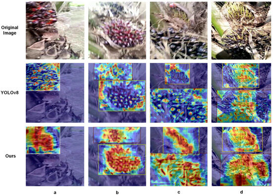 While deep learning proves highly effective for object detection tasks, its opaque internal processes often lack interpretability. To address this, our research employs heatmap visualization techniques that transform the "black-box" decision-making into human-comprehensible visual signals. These heatmaps utilize gradient color mapping to represent the contribution intensity of each pixel location to the model’s predictions, with warmer hues indicating higher contributions and cooler tones signifying lower relevance, thereby visually revealing regions of visual saliency prioritized by the model. The Grad-CAMPlusPlus method is used to generate heatmaps in this section. This study employs comparative visualization of recognition heatmaps between the baseline YOLOv8 model and our proposed palm fruit ripeness recognition model. As depicted in Figure 8, specular reflection occurs at the apex region of palm fruit granules under direct illumination, a phenomenon prominently visible in the original imagery due to the fruit’s smooth pericarp surface. Heatmap analysis reveals that the baseline YOLOv8 model exhibits over-attention to granules’ apex features, rendering it vulnerable to robustness degradation under specular reflection interference. In contrast, our proposed palm ripeness recognition model demonstrates holistic feature extraction across the entire fruit morphology, as evidenced by its heatmap distribution, yielding superior robustness through comprehensive feature extraction capability.