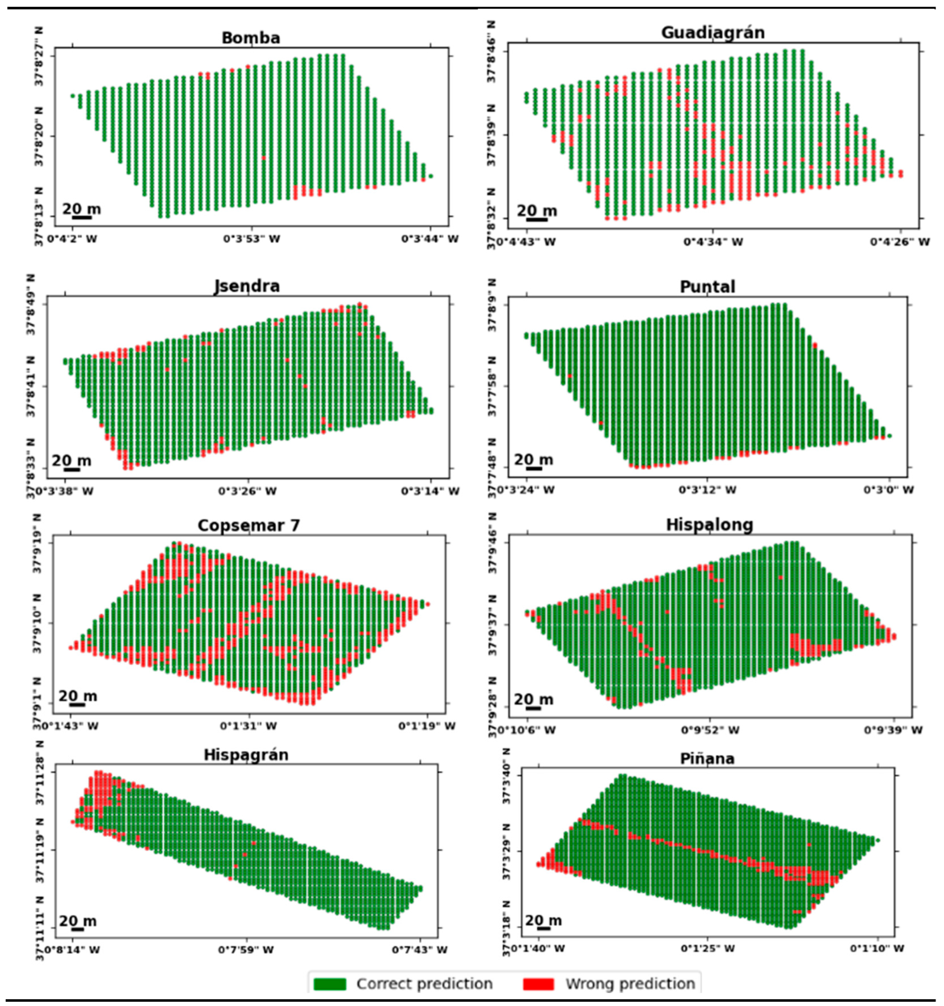 Barley, rice, corn (maize), wheat, rapeseed (Canola), alfalfa, sunflower, legumes, oats, vineyards, cherry trees, shrub grass, broad beans | RF and XGBoost | Navarre province, Spain | [46] |