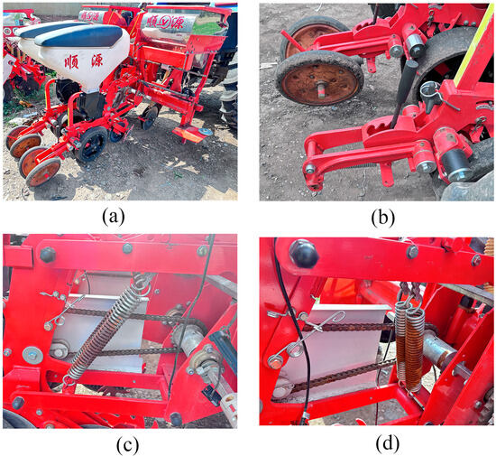 Different structures of the no-tillage planter: (a) ground wheel removed, representing BCD; (b) compression wheel removed, representing ABC; (c) spring installation direction under light no-till configuration; (d) spring installation direction under heavy no-till configuration.