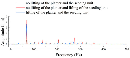 To comprehensively analyze the complex dynamic behavior of the no-tillage planter during field operations, a study was conducted on its multi-structural coupling vibrations. The amplitude spectrum curves under the AC configuration, which involved removing the fertilizing and stubble breaking and cleaning devices and the suppression wheels, are shown in