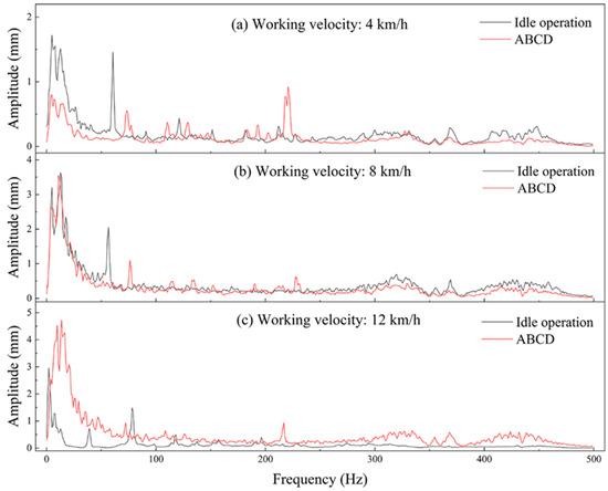 Figure 6. Under idle conditions, high-frequency components are observed. The high-frequency vibration frequencies at 4, 8, and 12 km/h were 60.55 Hz, 58.59 Hz, and 56.64 Hz, with amplitudes of 1.45 mm, 0.91 mm, and 2.05 mm, respectively. At low speed (4 km/h), the vibration intensity of the no-tillage planter under idle operation was significantly higher than during normal operation. However, at medium (8 km/h) and high (12 km/h) speeds, idle operation performs better than normal operation. A peak at 78.13 Hz posed a risk of resonance. Therefore, idle operation may be considered, provided it meets the power requirements of the equipment.