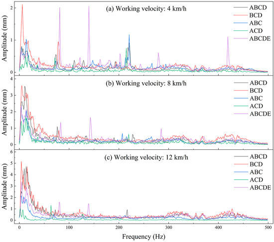 Figure 7. Under the BCD (removal of ground wheels) configuration, the vibration peak values at 4, 8, and 12 km/h were 2.11, 3.59, and 5.16 mm, respectively, which were significantly higher than the vibration peak values observed under the ABC, ACD, and ABCDE configurations. This indicated that the ground wheels, as the primary support structure of the no-tillage planter, played a major role in vibration reduction. At 4 km/h, under the BCD configuration, the amplitude in the low-frequency range was significantly higher compared to other configurations. In the mid-to-high-frequency range, the primary frequencies for the ABCD configuration were 81.05 Hz and 139.65 Hz, while the primary frequency for the BCD configuration was 79.10 Hz. The primary frequency components were similar and close to the inherent frequency of the tractor engine, resulting in a significant increase in vibration. As the working velocity increases, the primary vibration frequency in the ABCDE configuration decreases and shifts toward the low-frequency range.
