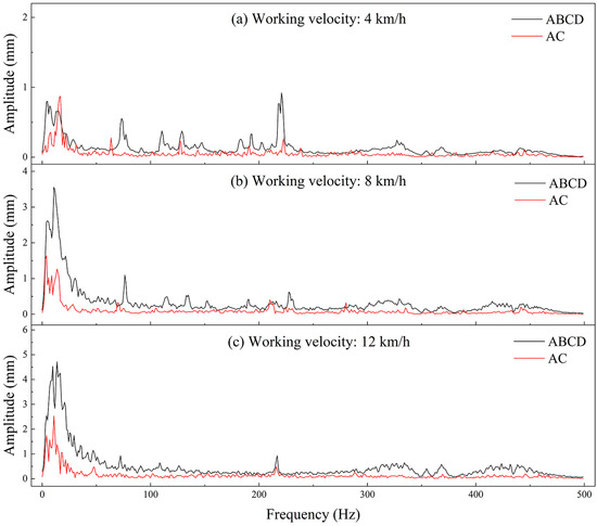 The comparison of ABCD configuration and AC configuration: (a–c) working velocities of 4 km/h, 8 km/h, and 12 km/h, respectively.