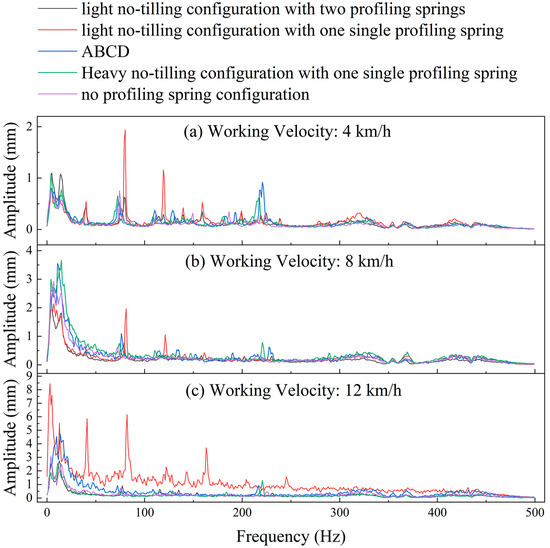 Figure 7, it could be seen that after removing the fertilizing and stubble breaking and cleaning devices (ACD configuration), the vibration intensity of the no-tillage planter significantly decreases. Based on the placement of the accelerometer, this indicated that the shift in the center of mass of the seeding unit towards the rear enhances its ability to resist random field vibrations. Additionally, the reduction in contact components also lowers the variation in tillage resistance, which helps to reduce the impact of the field surface on the vibration of the no-tillage planter. As the working velocity increased, the maximum peak value for the ABC configuration at 12 km/h was 2.16 mm, which was 0.22 mm lower than the 2.38 mm peak at 8 km/h. This trend was consistent with the amplitude variation observed under the ACD configuration, indicating that removing the suppression wheels also contributes to reducing the vibration intensity of the no-tillage planter during field operations. This effect may be due to the downforce provided by the mechanical profiling spring.