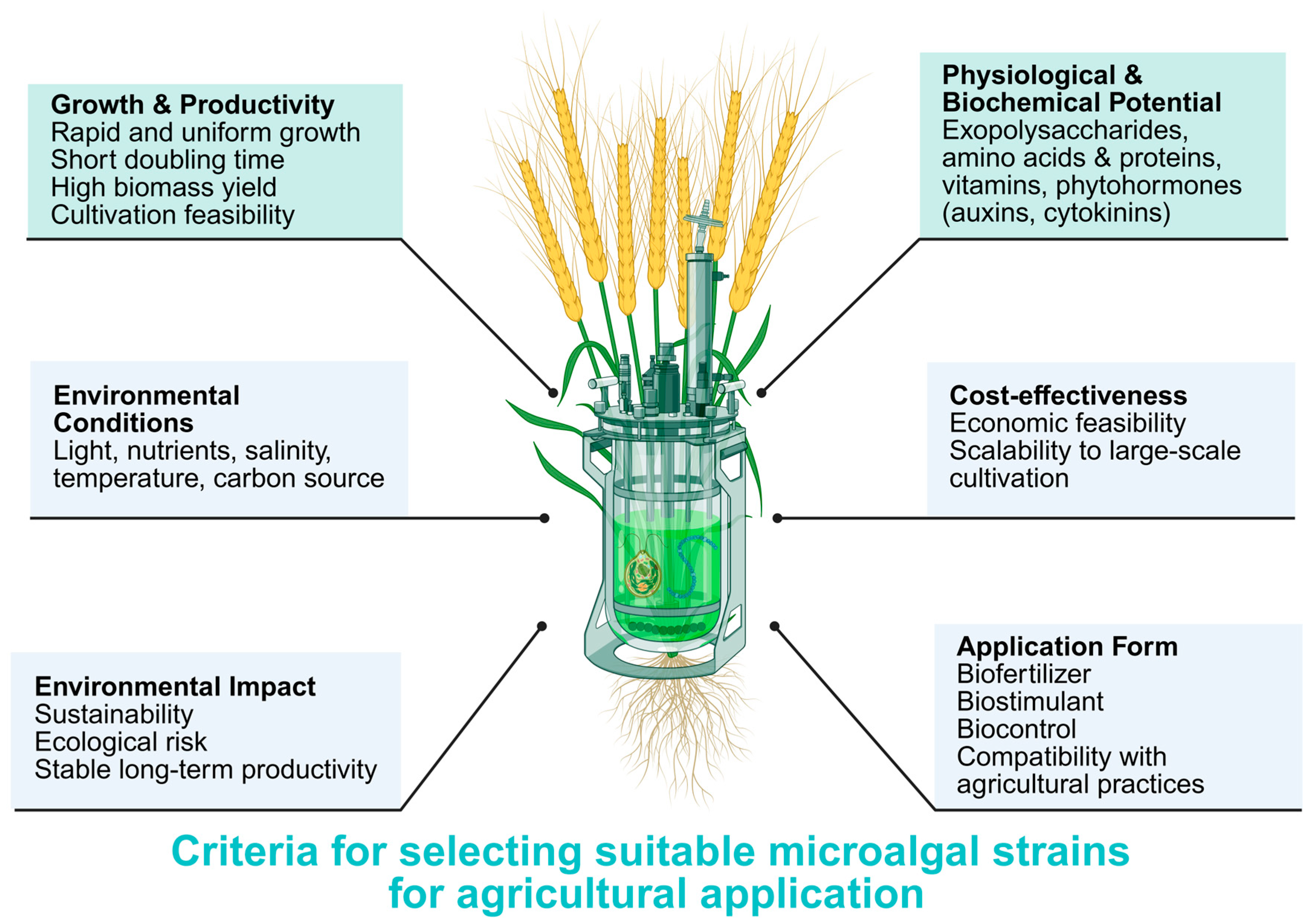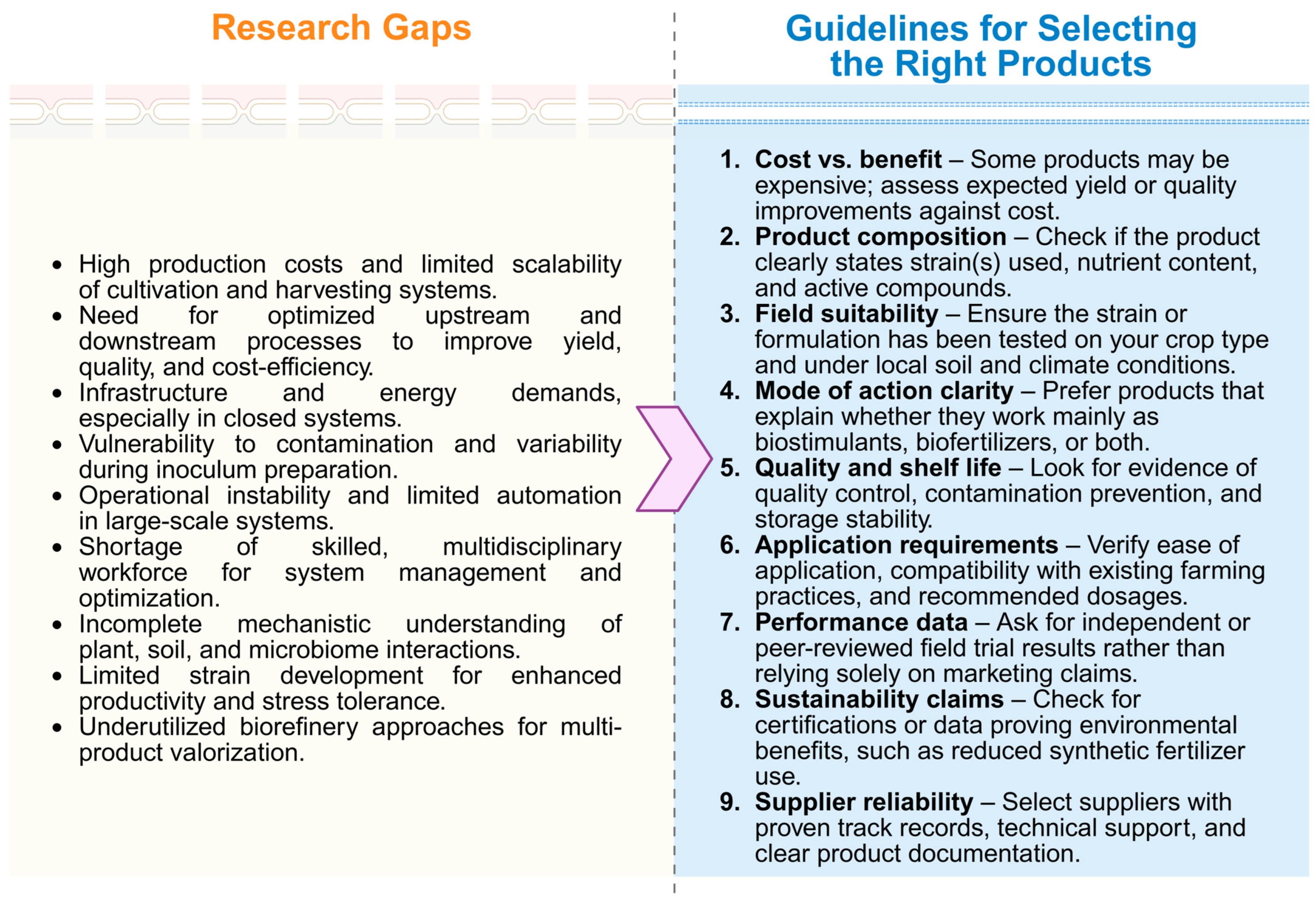- Mechanistic understanding—advancing molecular and physiological studies to clarify the interactions between plants and microalgae/cyanobacteria, thereby identifying the key pathways responsible for plant growth promotion and stress alleviation.