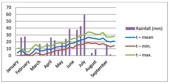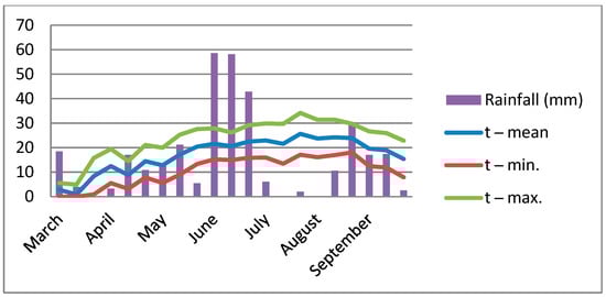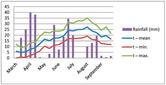 The mean monthly temperatures differed during the three experimental years, as in April and May in 2021 the T °C was higher compared with the same months in 2022 and 2023. The average and maximum temperatures during flowering and pod setting stages are important for grain formation and the quality and quantity of the final grain yield. The highest value of mean T °C in June was registered in 2022 with 21.5 °C, while the same month in 2021 and 2023 was 1.2 °C lower (Figure 1, Figure 2 and Figure 3). The average maximum T °C during the vegetation cycle in May ranged from 19.5 °C in 2023 to 24.2 °C in 2022, while in June the maximum average T °C was registered with 27.7 °C in 2022, as the same month in 2021 and 2023 showed a maximum average T of 26.5 °C. In July, the values of maximum temperature were over 30 °C, as follows: 32.0, 31.2, and 32.7 °C in consecutive experimental years. The monthly amount of rainfall differed by month and by year (Figure 1, Figure 2 and Figure 3). The biggest amount of rainfall from April to July was accumulated in 2023 with a value of 279.9 mm, while the quantity of rainfall in 2022 was 238.8 mm and in 2021—191.5 mm.