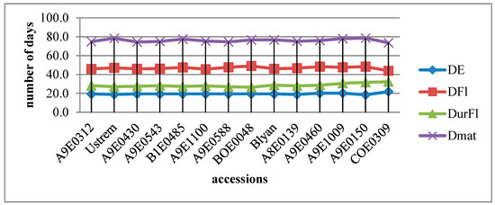 Field trials were sown at different dates during the period of experiment, as follows: in 2021 on 12th April, in 2022 on 6th April, and in 2023 on 11th April. Numbers of days to emergence differed from 16 to 22 days depending on T °C and amount of rainfall and its distribution, particularly in April after the seed sowing date. The least number of days to emergence (18.6) belonged to accession A9E0150 and the longest period of (21.9) days to emergence was registered with accession COE0309 (Figure 4). The minimum number of days (44) to reach 50% flowering was registered in the last mentioned accession, COE0309, while the maximum days (49.1) for 50% flowering was observed in accession BOE0048. The average number of days to reach flowering stage was 46.9. Most of the accessions entered into the mass flowering stage in the first and second decade of June. The average maximum temperatures in June 2021 were 26.5 °C, and the highest maximum temperatures were measured in third decade with 31.5 °C (Figure 1). In June 2022 and 2023, the average monthly temperatures were 27.7 and 26.5 °C, respectively. The maximum temperatures during the last two years were 29.5 and 29.6 °C (Figure 2 and Figure 3).