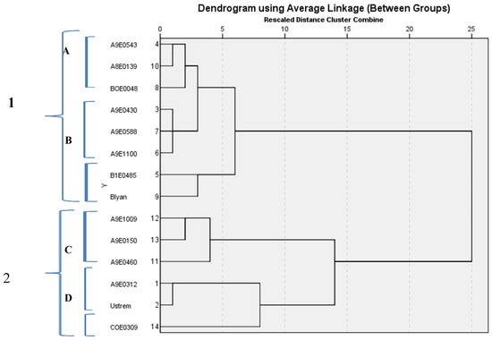 Intercluster coefficients showed the maximum value of genetic distance between accession A9E0460 and accession BOE0048, followed by accession A9E0460 and accession A9E0543, and accessions A9E460 and A9E0430 (Table 8). The second cluster contained five accessions divided into two sub-clusters, and one accession was located individually. The first three accessions showed similarities in several morphological traits and they differed from other accessions with the lowest yield per plot. The accession A9E0312 and cultivar “Ustrem” showed similar yield per plot and related yield components. The accession COE0309 was situated individually and differed from others in the group with the shortest vegetation cycle, with the longest pods and the biggest number of seeds per pod.