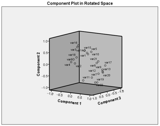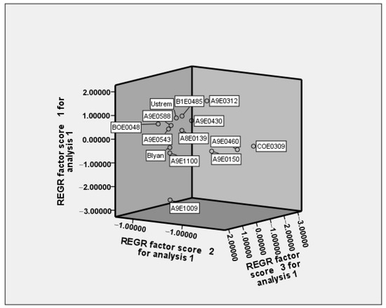 For the second component, the most important characteristics were days to flowering, days to maturity, plant height, weight of plant without pods, pod width, and weight of 100 seeds. For the separation in the third component, the first pod height was recognized. The genotypes A9E1009, COE0309, and A9E0460 were of special interest due to their high values along the first, second, and third components (Figure 6). The genotype COE0309 was characterized by the smallest number of days to flowering and the shortest cycle to reach maturity. This is an advantage in plant growth as the high temperatures and low air humidity during flowering and pod setting stages may be avoided and consequently more pods and well matured seeds can be produced by the end of vegetation period. The genotype COE0309 was differentiated from others with the highest weight of 100 seeds (var21). The accession A9E1009 possessed one of the highest number of pods per plant, the smallest number of seeds per pod, and the lowest weight of 100 seeds. These characteristics were situated in the opposite side of the accession A9E1009 in PC1.