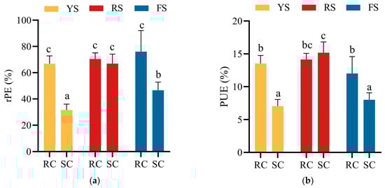 Overall, rapeseed cake exhibited rPE and PUE values similar to those of soybean cake in red soil. In the other two soils, rapeseed cake outperformed soybean cake. This pattern indicates that rapeseed cake provides a more stable and efficient phosphorus release across soils.