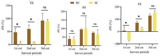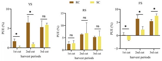 Phosphorus use efficiency (PUE) of cake fertilizers in three soils at different harvest periods. * represents a significant difference between treatments (p < 0.05), ns represents no significant difference (p > 0.05).