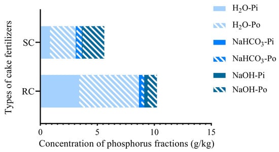 Phosphorus fractions in the cake fertilizers were analyzed using a modified Hedley sequential fractionation [24,25]. Extractions were performed in sequence with deionized water, 0.5 mol L−1 NaHCO3, 0.1 mol L−1 NaOH, and 1.0 mol L−1 HCl. Phosphorus in each extract was measured by the molybdenum blue method. Inorganic phosphorus (Pi) was taken as the sum of the water- and bicarbonate-extractable fractions, and organic phosphorus (Po) was calculated as TP minus total Pi.