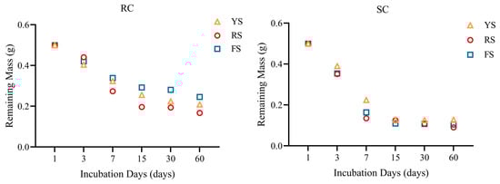 The weight-loss dynamics of the two cake fertilizers over 60 days in the three soils are shown in Figure 5. For each cake, neither the trend in mass loss nor the residual mass differed significantly among soils (p > 0.05). Rapeseed cake decomposed more slowly and retained a greater residual mass than did soybean cake. This finding indicates that differences in rPE are not closely linked to overall mass loss. This also suggests that decomposition dynamics do not mirror P uptake patterns. By day 60, soybean cake had lost approximately 80% of its initial weight, whereas rapeseed cake had lost about 60%. In both cakes, the rate of weight loss markedly slowed after 15 days.