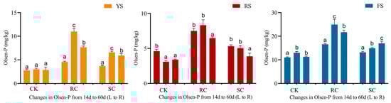 Weight variation of rapeseed and soybean cakes decomposition in different soils. Changes in soil Olsen-P content over time under different treatments. Different letters in the same column represent significant differences (p < 0.05) between different periods, and L to R represents left to right.