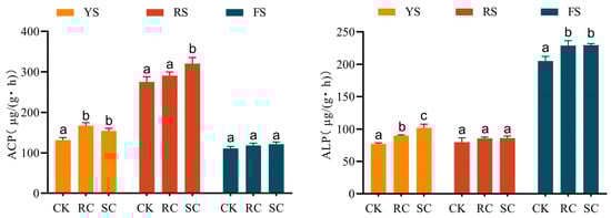 Soil acid phosphatase (ACP) and alkaline phosphatase (ALP) activities in different treatments. Different letters indicate significant differences (p < 0.05) between treatments.