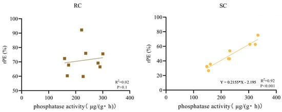 Correlation between soil phosphatase activity and relative phosphorus efficiency (rPE) of cake fertilizer.