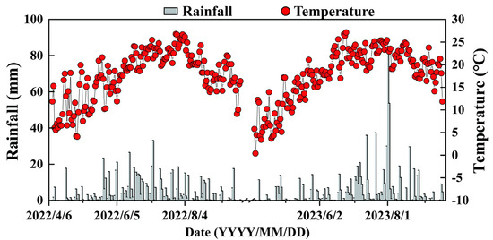The experimental site is located at the farm in Shanhe Town of Wuchang City, Heilongjiang Province, China (44.73° N, 127.23° E). This region has a temperate monsoon climate, with characteristics of a cold temperate humid continental climate. The average temperatures during the rice growth period in 2022 and 2023 were 17.6 and 17.8 °C, respectively, with total rainfall amounts of 669.0 and 783.7 mm, respectively (Figure 1). The main soil (silty clay loam) properties (0–20 cm depth) were as follows: bulk density (BD) of 1.08 g cm−3, soil pH of 6.3, soil organic carbon (SOC) and total N (TN) contents of 28.63 and 1.52 g kg−1, nitrate (NO3−) of 14.36 mg kg−1, ammonium (NH4+) of 17.11 mg kg−1, available phosphorus (Olsen P) of 16.32 mg kg−1, and available potassium (AK) of 95.63 mg kg−1.